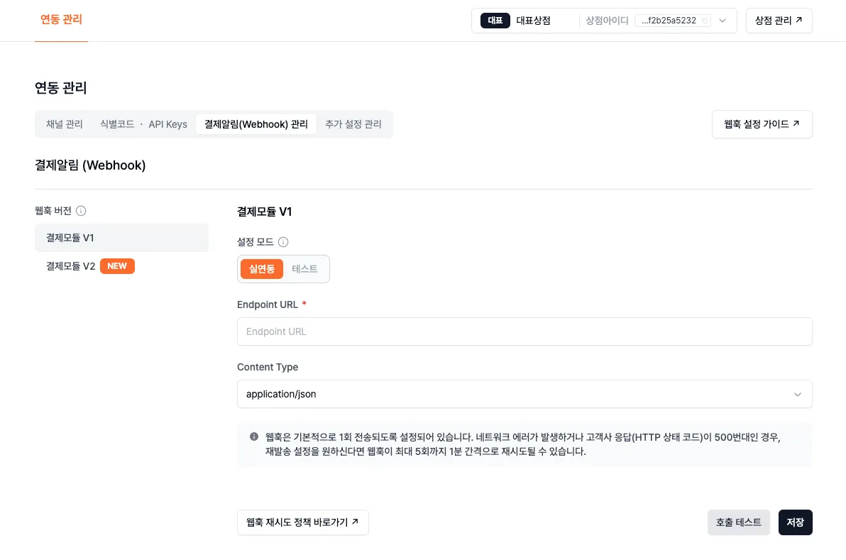• [웹훅 버전] 항목에서 [결제모듈 V1] 을 선택합니다.